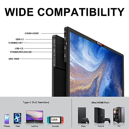 Our monitor offers wide compatibility, featuring two USB Type-C ports and a Mini-HDMI port for seamless connectivity to laptops, smartphones, PCs, gaming consoles, and more. Whether you're on a business trip, traveling, or enjoying home entertainment, this portable monitor makes it easy to extend your screen or play games effortlessly.