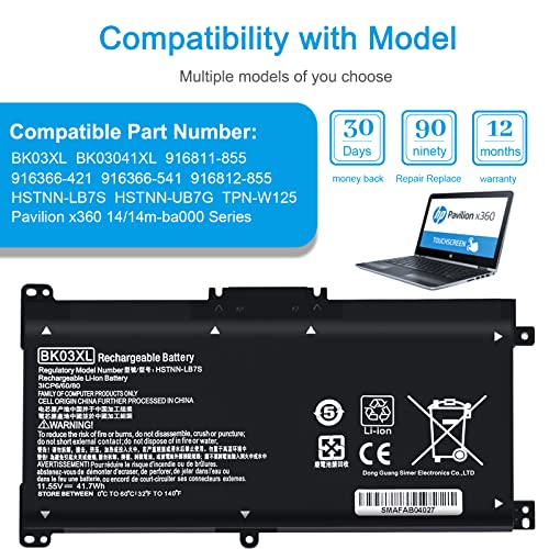 Voltage: 11.55V; Capacity: 41.7Wh / 3470mAH; Type: Lithium-ion. Included: 1PK BK03XL laptop battery, no extra purchases needed. Compatibility: Works seamlessly with HP Pavilion X360 models including 14m-ba011dx, 14m-ba114dx, 14-ba253cl, and more in the 14 14m series. Part Numbers: Fully compatible with part numbers 916366-421, 916811-855, BK03XL, among others. Ease of Use: Direct replacement for your original HP battery, ensuring a hassle-free installation and consistent performance. Safety Assured: Certified by CE and FCC, you can count on this battery for safe, reliable power.