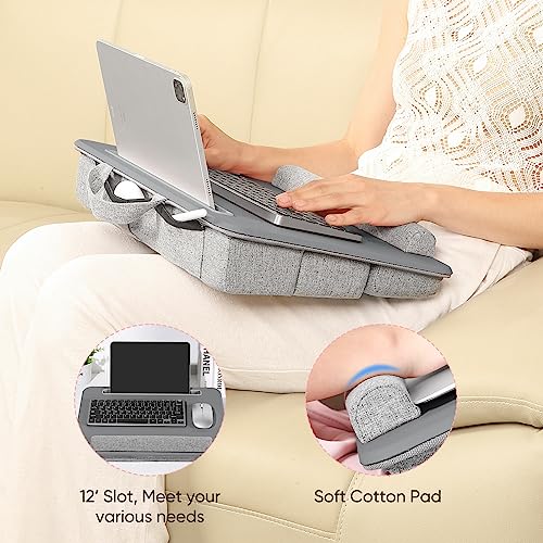 Adjustable Height: The cushion can be folded and adjusted for your preferred height, offering flexibility whether you’re sitting on the couch, bed, or floor. Functional Design: Includes a 12" slot to hold your phone or tablet, and a spacious pocket for storing headphones and other small items, keeping essentials within easy reach. Comfort & Support: The bolster cushion provides stability and skin protection, featuring a high-resilience sponge that retains its shape. The extended wrist rest prevents computer sliding and supports your wrists. Integrated Mouse Pad: The lap tray includes a hand-sewn, high-quality PU mouse pad that is easy to clean and designed for unrestricted mouse movement, suitable for both left and right-handed users. Portable: Lightweight design with a built-in handle makes this lap desk easy to carry, ideal for use at home, in a coffee shop, or on the go.